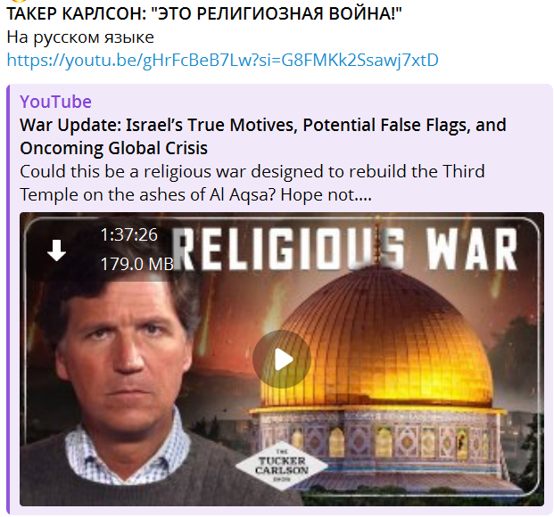 Tucker Carlson прокомментировал на своём YouTube-канале видео, опубликованное американским солдатом в рядах ЦАХАЛ. В ролике военный открыто заявил, что участвует в войне ради восстановления Третьего храма в Иерусалиме.