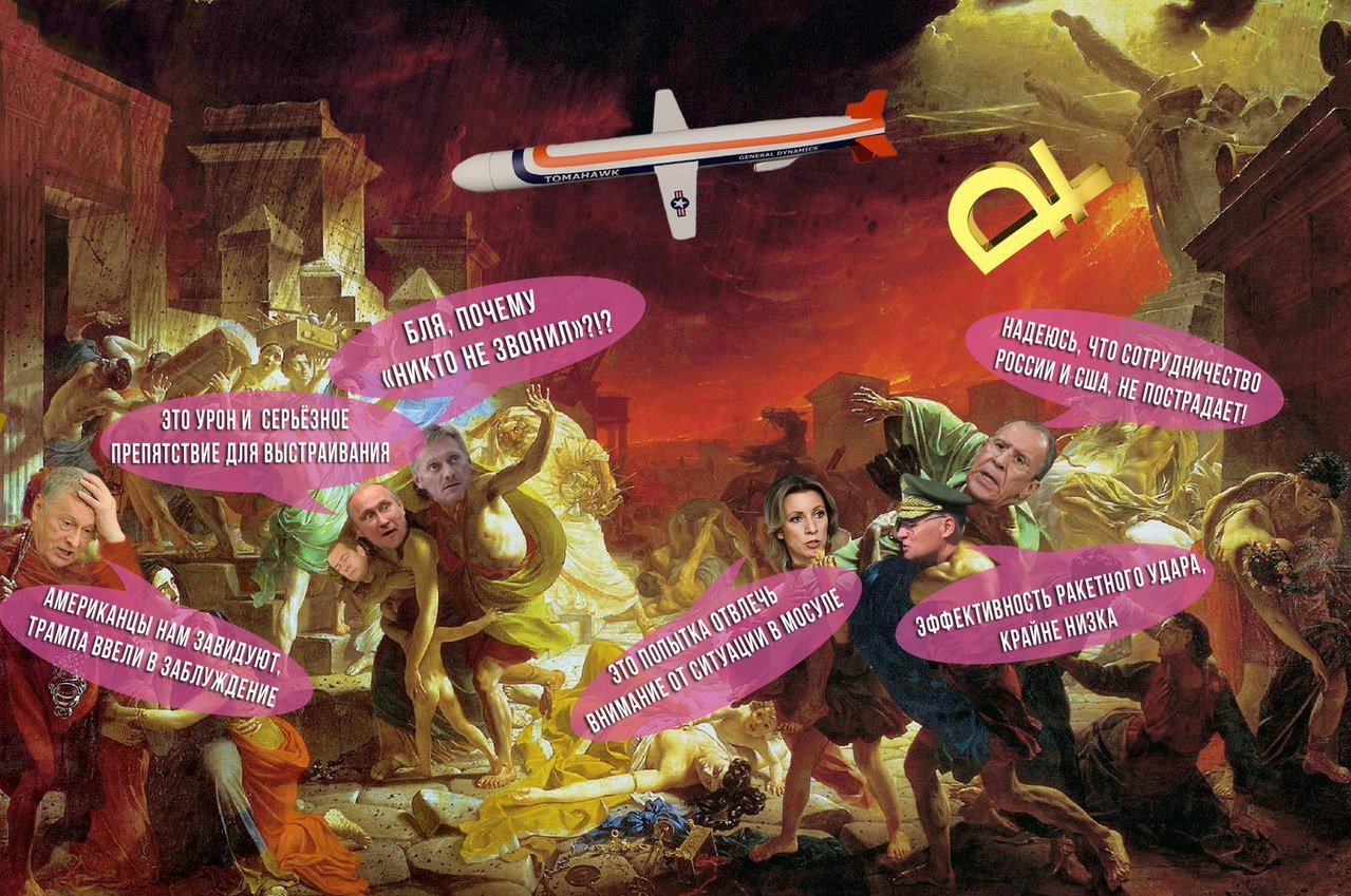 Ища отклики на атаку США, Великобритании, Франции на Сирию в российских СМИ пришёл к выводу что повидимому есть приказ не выпячивать тему. Ай-яяй-что ж это такое?! Нечем ответить? В штаны наделали? Скромно реагируют. Особо даже не негодуют. Нерешительная внешняя политика злит”. (орфография сохранена)