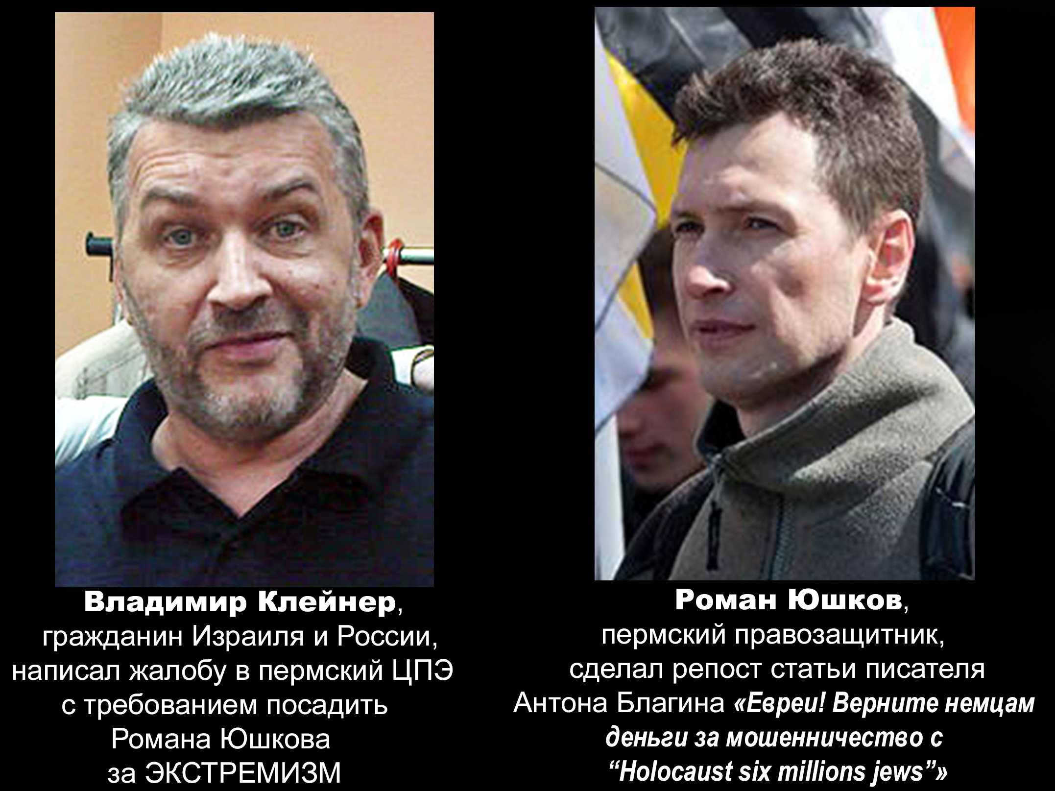 Вот она, удивительная картина современной русской жизни. На скамье подсудимых — пермский общественный деятель, публицист и университетский преподаватель, кандидат наук Роман Юшков. Вина его страшна: заигравшись в свободу научного поиска и в свободу журналистского слова, он кощунственно покусился на самое (запомните, кто ещё не выучил — САМОЕ!) в современном мире святое: подверг сомнению цифру «6 миллионов погибших во Второй Мировой евреев». Для тех, кто не понял, проговорим ещё раз: число погибших тогда русских, белорусов, татар и др. никого не волнует, здесь вам ваша песочница со свободой слова: называйте любые цифры. Или говорите, что никто вообще не погиб. А вот еврейские жертвы не смейте трогать грязными лапами и выколите у себя на лбу: «6 миллионов»!