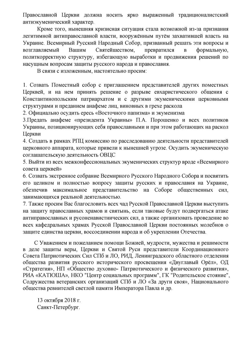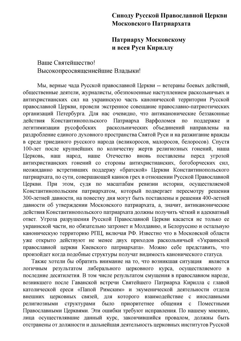 Как говорится в открытом письме Синоду РПЦ группы петербургских ветеранских и патриотических организаций, которые в субботу собрались на экстренное совещание в гостинице «Москва» по инициативе Координационного совета патриотических сил Петербурга, Русского имперского движения, «Народного Собора» и еще полутора десятков организаций, «Для нас очевидно что беззаконные действия Константинопольского Патриарха Варфоломея по поддержке и легитимизации русофобских раскольнических объединений направлены на раздробление единого духовного пространства Святой Руси и на разжигание вражды в среде триединого русского народа (великоросов, малоросов, белоросов)».