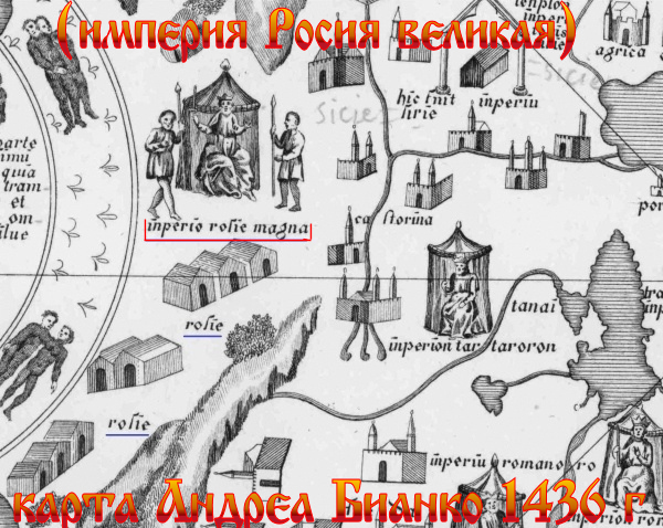 Или, к примеру, карта Андреа Бианко 1436 г., где мы видим две надписи rosie, а под изображением шатра с восседающим в нём московским князем — imperio Rosie magnа (империя Росия великая).