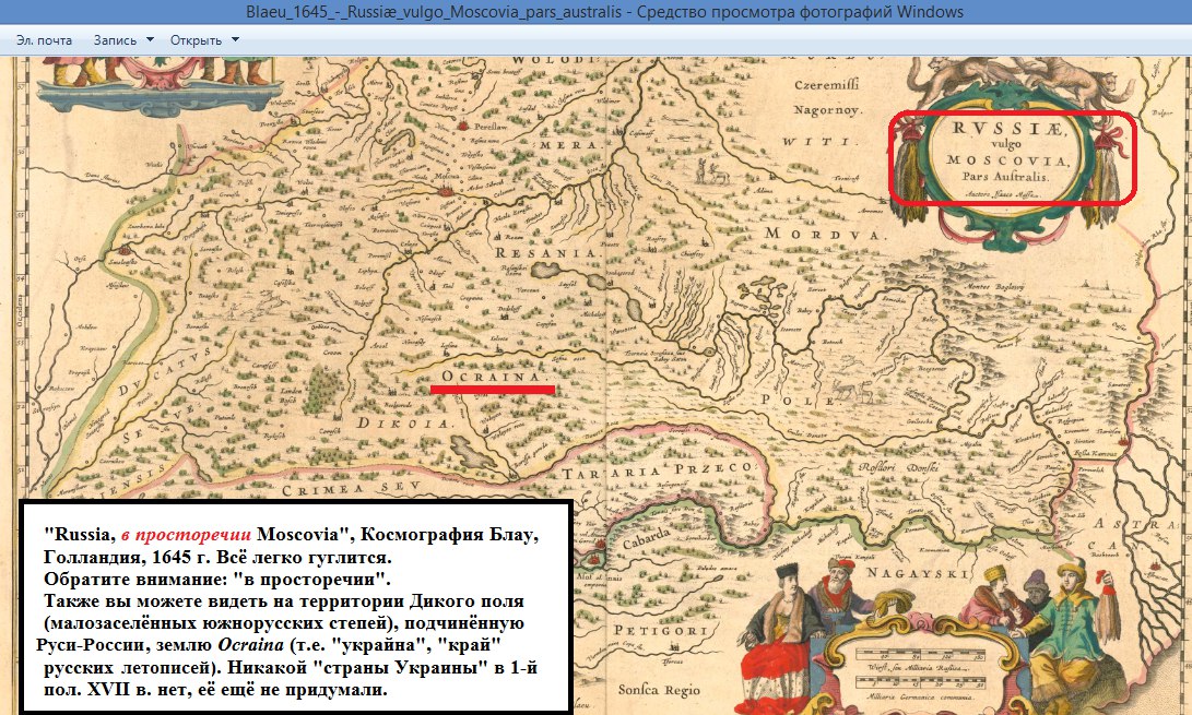 Что же до распиаренной «укрáинствующими» карты Боплана, то она на самом деле не раскрашена в разные цвета (если вы видите её раскрашенной, то это фейк). Карта носит название Delineatio generalis Camporum Desertorum vulgo Ukraina, cum adjacentibus Provinciis (т.е. «Общий план Диких полей, проще именуемых Украина, с прилежащими провинциями). Притом, даже из названия видно, что Ukraina — это просторечное (“вульгарное”) название местности “Дикое поле”, а вовсе не страна. И Боплан имел в виду не «страну Украину», но окраинную местность Русского и Польского государств.