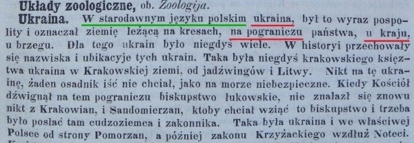 Само название Ukraina означает “окраина” как на древнерусском, так и на старо-польском. Немецкий лингвист Макс Фасмер давно доказал, что название страны “Укрáины” восходит к др.-рус. др.-русск. окраина “пограничная местность”. Все остальные попытки этимологии “Укрáины” (якобы от “краины”-страны или от балтийского племени укран) являются лингвофричеством и абсолютно ненаучны. Кстати, по-старопольски Ukraina также означает “окрáина”.