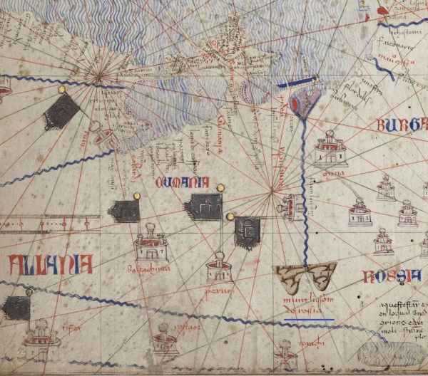 К примеру Каталанский атлас Авраама Креска (Abraham Cresques) 1375 г. имеет красно-синюю надпись на территории «Московии» ROSSIA (правый край фрагмента). Левее изображены горы, подписанные: munt lussom de rossia. У нижнего края фрагмента обозначены Тверь – tifer, Ростов – rostaoⱱ.