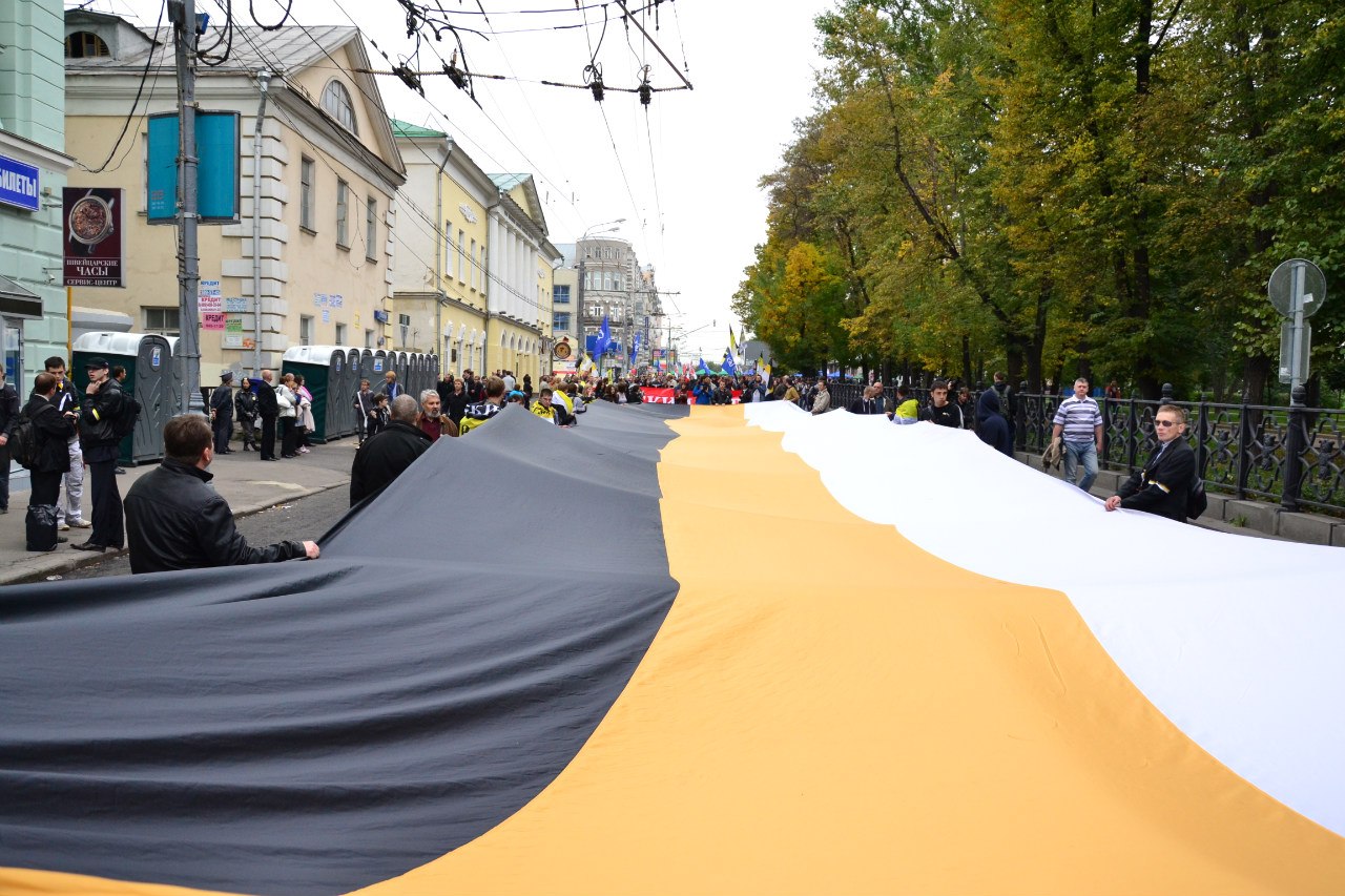 «Красные» и «белые» шествовали двумя колоннами и соединились на подходе к проспекту Сахарова. В начале Марша несколько анархистов развернули загадочный черный транспарант с надписью «Экзистенциальная Россия». Где-то в глубине шествия затерялась колонна «Вузов, школ и НИИ».
