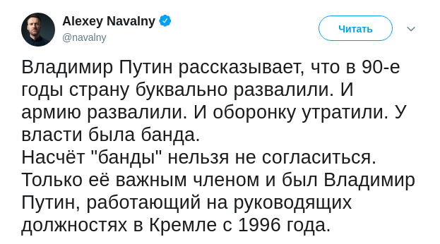 “Я не буду называть бандой тех людей, которые были у руля в 90-х годах, но хочу отметить, что за это время у нас полностью развалилась социальная сфера, промышленность, оборонка – мы утратили оборонку, мы практически развалили Вооружённые Силы, довели страну до гражданской войны, до кровопролития на Кавказе, и поставили страну на грань утраты суверенитета и развала – надо прямо об этом сказать. Поэтому, конечно, далеко не все люди, которые работали в 90-е годы, несут за это ответственность, но наверняка, если ведь это произошло, есть и такие, которые должны нести за это ответственность. Повторяю, я не хочу называть их бандой, но это результат их работы”. – Сурово обличил прежнее руководство страны Владимир Путин, но не назвал ни одной фамилии. И не зря. Потому что в кого не ткнёшь, оказывается, что, по мнению президента, это достойнейший человек. Егора Гайдара Путин чтит, как “настоящего гражданина и патриота, сильного духом человека, талантливого ученого, писателя и практика”, Борис Ельцина, по мнению преемника, “возглавил процесс кардинальных перемен, которые вывели Россию из тупика.” Ельцинский глава МЧС Сергей Шойгу у Путина – министр обороны, бывший премьер Сергей Кириенко – замглавы администрации, экс-вице-премьер Анатолий Чубайс рулит стратегической госкорпорацией “Роснано”… Вот и получается, что за 90-е ответственный анонимные злодеи, а реально никто не виноват. Само собой, скромный работник госбезопасности, который в 1997-98 гг. занимал должность замруководителя администрации президента, а затем директора ФСБ тоже не при делах.http://www.apn-spb.ru/news/article30348.htm