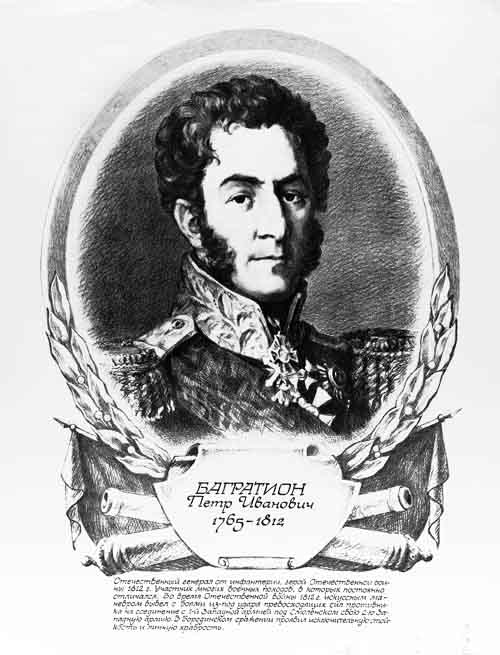 Генерал Багратион происходил из древнего рода грузинских царей Багратидов, его дед, царевич Александр, переехал в Россию в 1757 г., имел чин подполковника. Петр Багратион в 17 лет был определен Г.Потемкиным в Кавказский мушкетерский полк сержантом, принял участие в экспедициях против чеченцев, в одном из боев получил тяжелое ранение, оказался в плену, но горцы вернули его в русский лагерь без выкупа из признательности к отцу Багратиона, оказавшему им какую-то услугу. С Кавказским мушкетерским полком участвовал в русско-турецкой войне 1787 – 1791 гг., в 1788 г. под знаменами Потемкина бесстрашно проявил себя при штурме и взятии Очакова.В 1793 г. Багратион перешел в Софийский карабинерный полк, с которым действовал в Польше против повстанцев; состоял под началом Суворова, за мужественный и честный характер заслужил большое уважение и симпатию полководца. “Князь Петр”, как ласково называл Суворов Багратиона, стал его незаменимым помощником в Итальянском и Швейцарском походах против французов (1799 г.). В Итальянском походе генерал-майор Багратион во главе авангарда русско-австрийской армии взял штурмом крепость Брешиа, овладел городами Бергамо и Лекко, отличился в трехдневном сражении на берегах рек Тидоны и Треббии; был дважды ранен, но не покидал войск. В сражении у Нови Суворов возложил на него проведение удара, решившего исход битвы. За участие в Итальянском походе фельдмаршал подарил князю Петру свою шпагу, с которой тот не расставался до конца жизни.В легендарном Швейцарском походе через Альпы Багратион шел в авангарде армии Суворова, прокладывая путь войскам в горах и первым принимая на себя удары противника. При атаке Сен-Готардского перевала сумел через скалы зайти в тыл французов, и перевал был взят. После преодоления Чертова моста боями проложил дорогу в долине Клюнталь. Командуя арьергардом, прикрывал выход русско-австрийской армии из окружения, 6-й егерский полк, составлявший бессменное ядро его отряда, окончил кампанию в составе всего шестнадцати офицеров и трехсот солдат. В Швейцарском походе Петр Иванович был в третий раз ранен.С 1800 г. Багратион являлся шефом лейб-гвардейского егерского батальона, начало которому в 1792 г. положил цесаревич Павел, и переформировывал его в полк. С открытием военных действий Австрии и России против Франции в 1805 г. ему был вверен авангард армии Кутузова. Из-за неудачных действий австрийцев русская армия дважды оказывалась перед угрозой окружения, и дважды авангард, становясь арьергардом, геройски прикрывал отход основных сил Кутузова. Особенно в трудном положении русская армия оказалась после сдачи австрийцами Вены, и Кутузов, уводя войска маршем от Кремса к Ольмюцу, приказал Багратиону: “Лечь всем, но задержать врага”. Дав клятву устоять, доблестный генерал с 6-тысячным отрядом весь день 4 ноября под Шенграбеном сдерживал натиск впятеро превосходившего его противника. Лишь получив сведения о благополучном отходе русских войск, он штыками проложил себе путь через кольцо окружения и присоединился к Кутузову, при этом привел еще пленных и принес захваченное знамя. За этот блистательный подвиг он был удостоен чина генерал-лейтенанта, а 6-й егерский полк, вновь составлявший основу его отряда, первым из полков русской армии получил в награду серебряные трубы с Георгиевскими лентами. В несчаст