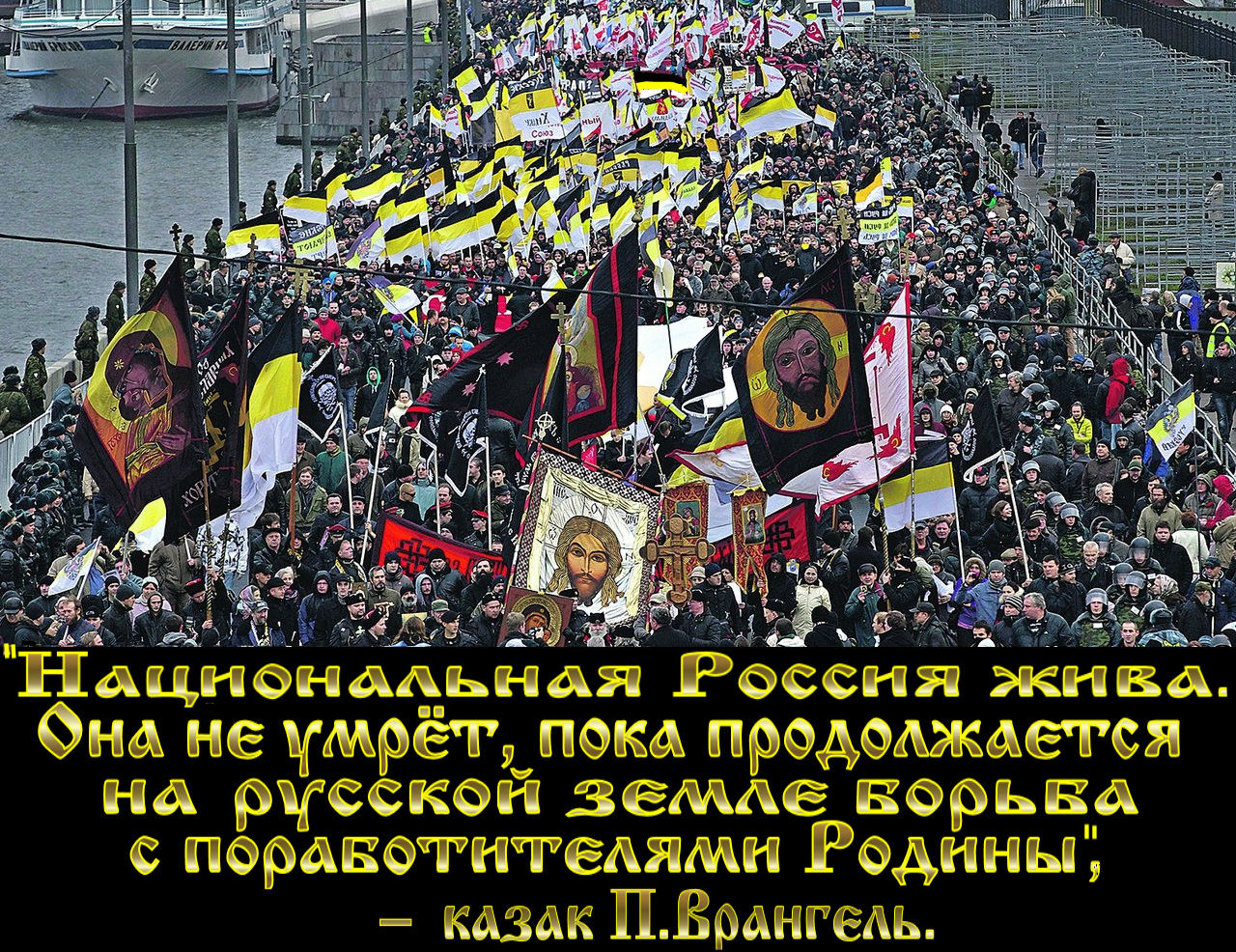 «С чистыми национальными лозунгами», – завет барона Врангеля. Каковы же наши лозунги? С чем мы обращаемся к людям? Людям довольно бессмысленно говорить об «окрасах». По крупному счёту, дискурс «белые»-«красные» волнует только белых и красных – подавляющее меньшинство. Более того, понятие «белый» неподготовленным человеком редко может быть воспринято в должной степени серьёзно. Как минимум, для среднестатистического восприятия это что-то очень далёкое от реальной жизни. И неслучайно Врангель говорит не о чистых белых лозунгах, но о национальных. Белое = русское. Поэтому обращаться нужно не к индикатору цветов, а к живому национальному чувству. Именно национальное чувство объединяет русских, именно оно способно мобилизовать людей к действию, и обращение к нему вызывает наиболее живой отклик в сердцах. Неслучайно в годы Великой Отечественной большевистская власть, защищая саму себя, обратилась не к какому-нибудь интернациональному долгу советских граждан, но к дотоле оплёванному ею же русскому патриотизму русских людей. Сегодня запрос на русские идеалы, на русскость весьма высок. И это ключ к «кропотливой работе по проникновению в психологию масс».