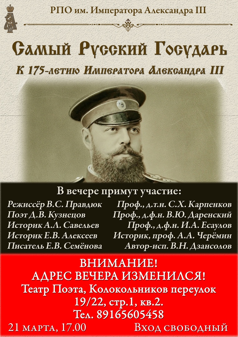 Приглашаем Вас на торжественный вечер в честь 175-летия нашего Государя Александра Третьего!