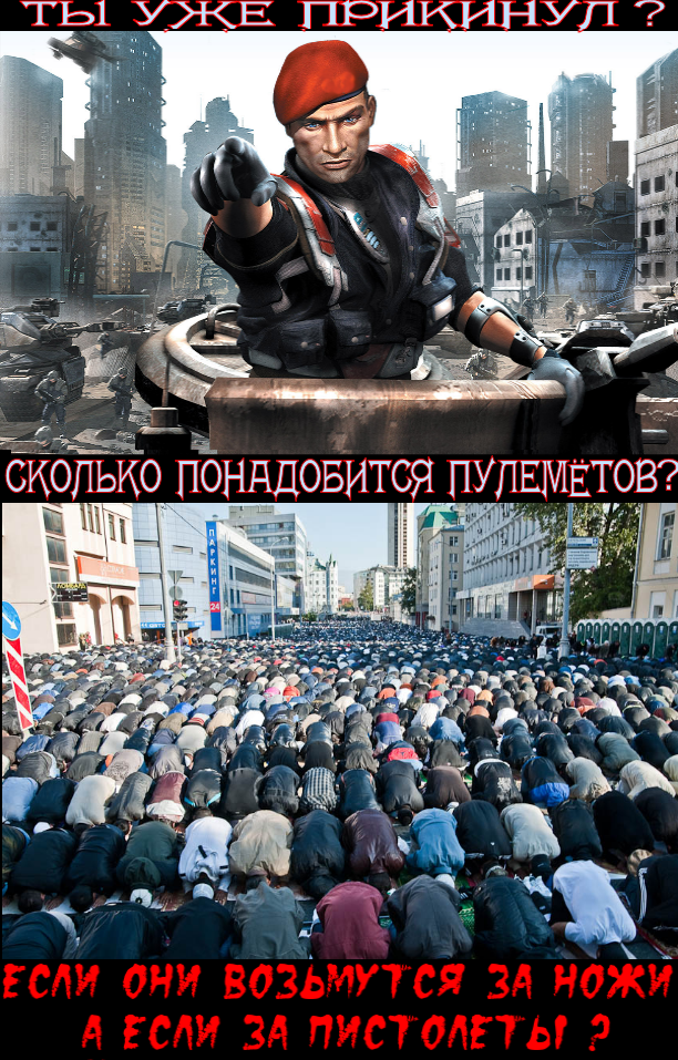 В условиях массовых выступлений мигрантов полиция будет разгромлена и уничтожена физически в течение нескольких часов – силой, способной навести порядок, останутся лишь воинские части, но их численности будет критически недостаточно для противостояния миллионам мигрантов в условиях городской агломерации, а о подготовке к боям в городских условиях – и говорить не приходится. Какая численность войск понадобится, например, для освобождения Москвы, занятой 100-200-тысячной армией мигрантов, среди которых есть боевики, имеющие опыт войны на Кавказе и в Сирии? И это только при условии участия в незаконных вооружённых формированиях лишь каждого десятого мигранта в регионе, а если "за топор" возьмётся каждый пятый, каждый третий? – мало кто захочет упустить шанс разграбить богатейший город и жить потом годами у себя в ауле богатым человеком!