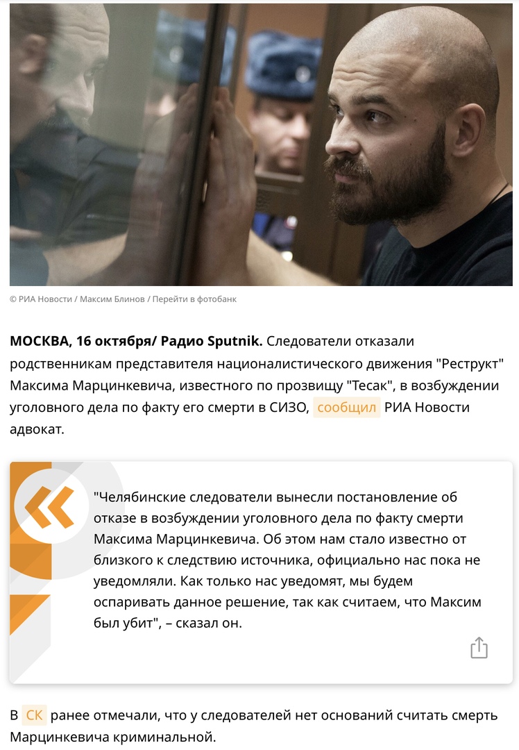 16 сентября стало известно о том, что лидер ультраправого движения "Реструкт" Марцинкевич погиб в челябинском следственном изоляторе №3. ГУФСИН по Челябинской области сообщило, что Марцинкевич покончил с собой, а в Следственном комитете по области заявили, что Тесак оставил предсмертную записку. Прокуратура области также объявила о проверке.
