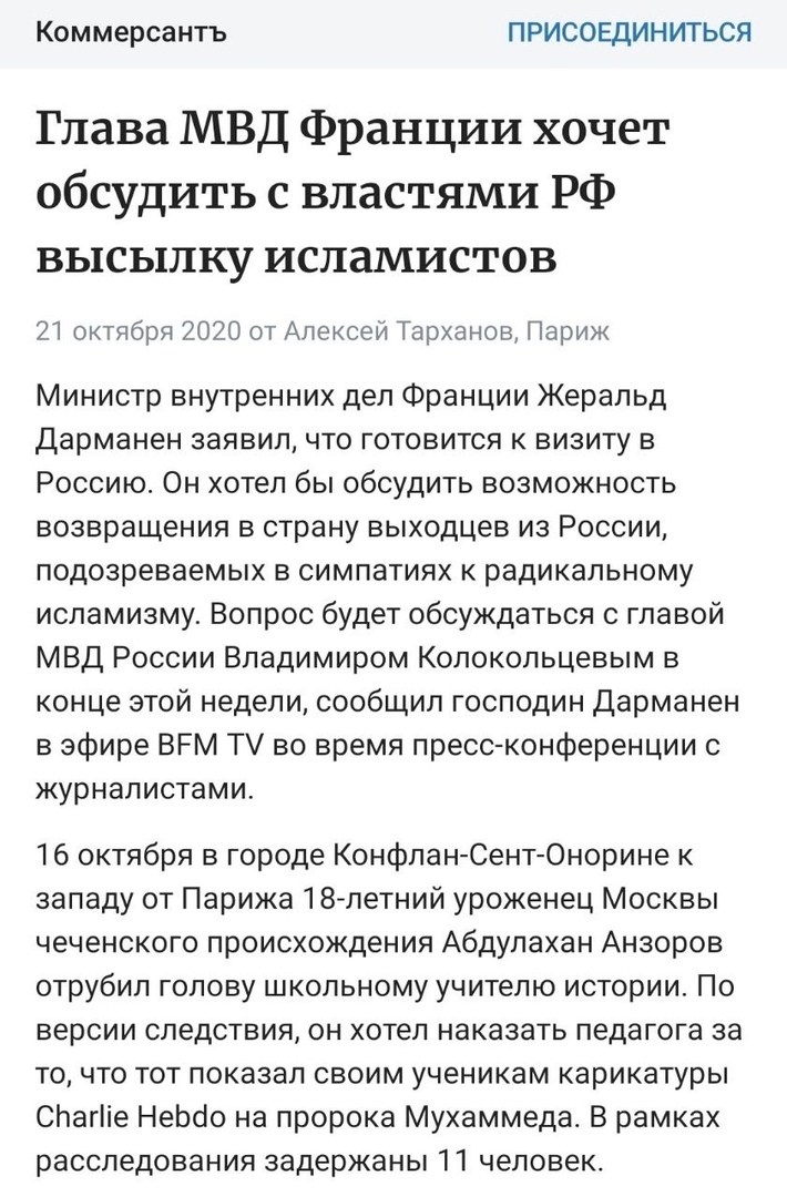 Франция хочет выслать в Россию представителей одной из толерантных республик .Нам, конечно, жаль несчастных французов, столкнувшихся с безжалостными террористами, отрезающими людям головы, но в России и так хватает этого … У нас, к сожалению, преступники спокойно отрезают ДЕТЯМ головы, но это властями не считается чем-то зверским. В России террористов, которые бегают по столице с отрезанной головой русской девочки, не пристрелят на месте, как бешеную собаку, их не посадят. Им ничего не будет. Их трогать нельзя. И у нас оправдывают того, кто убил французского учителя. Так что… Оставьте себе. Вам проще справиться с этой заразой.