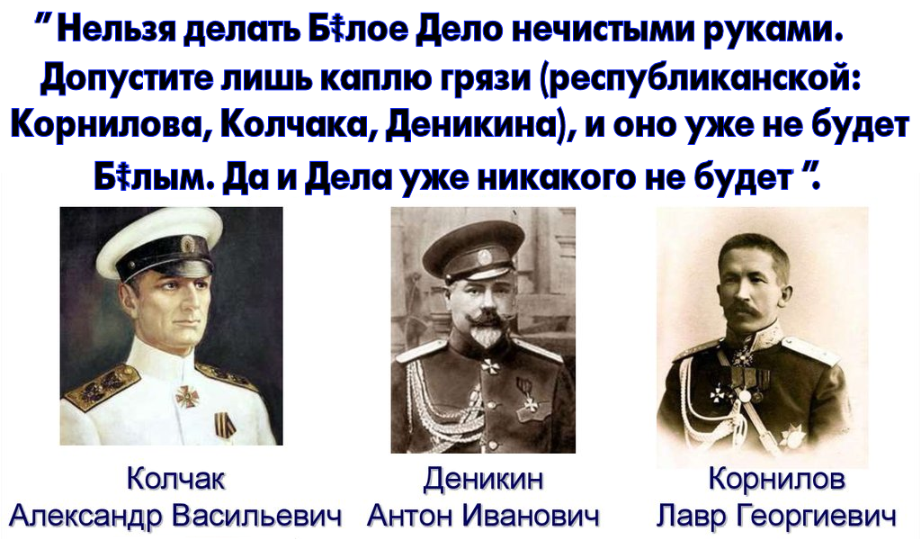 1. О том, что Белые – это сплошь февралисты, повинные в измене Царю, а, значит, не лучше большевиков. О Колчаке «историк» прямо так и пишет, что, мол, не лучше Александр Васильевич Троцкого, и вообще шпион иностранных разведок, и на контроле охранки состоял ещё с 5-го года, как неблагонадёжный, и жене, и Родине изменял – в общем, самый лютый злодей. Заметим, что такой степени ахинеи и клеветы на адмирала не возводили даже большевики.
