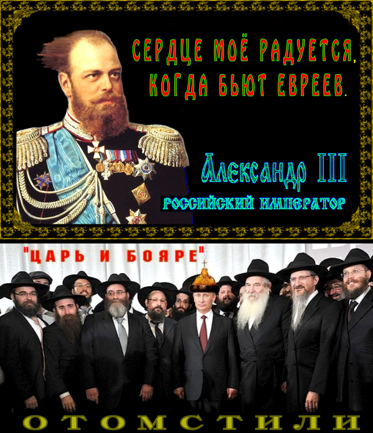 Царь Александр III, был "Царём, удерживающим ☦Россию и ☦Русский народ" в спасительном антисемитизме (антижидизме). Сын же его, Цесаревич Николай, к сожалению, не смог этого сделать, за что и поплатился потерей Российской Империи.