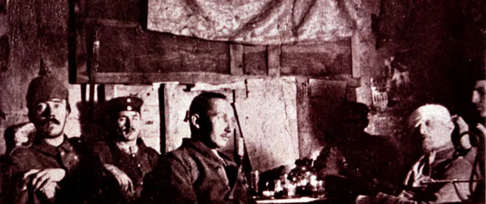 Гитлер (слева) вместе с сослуживцами в землянке в 1914 году.
