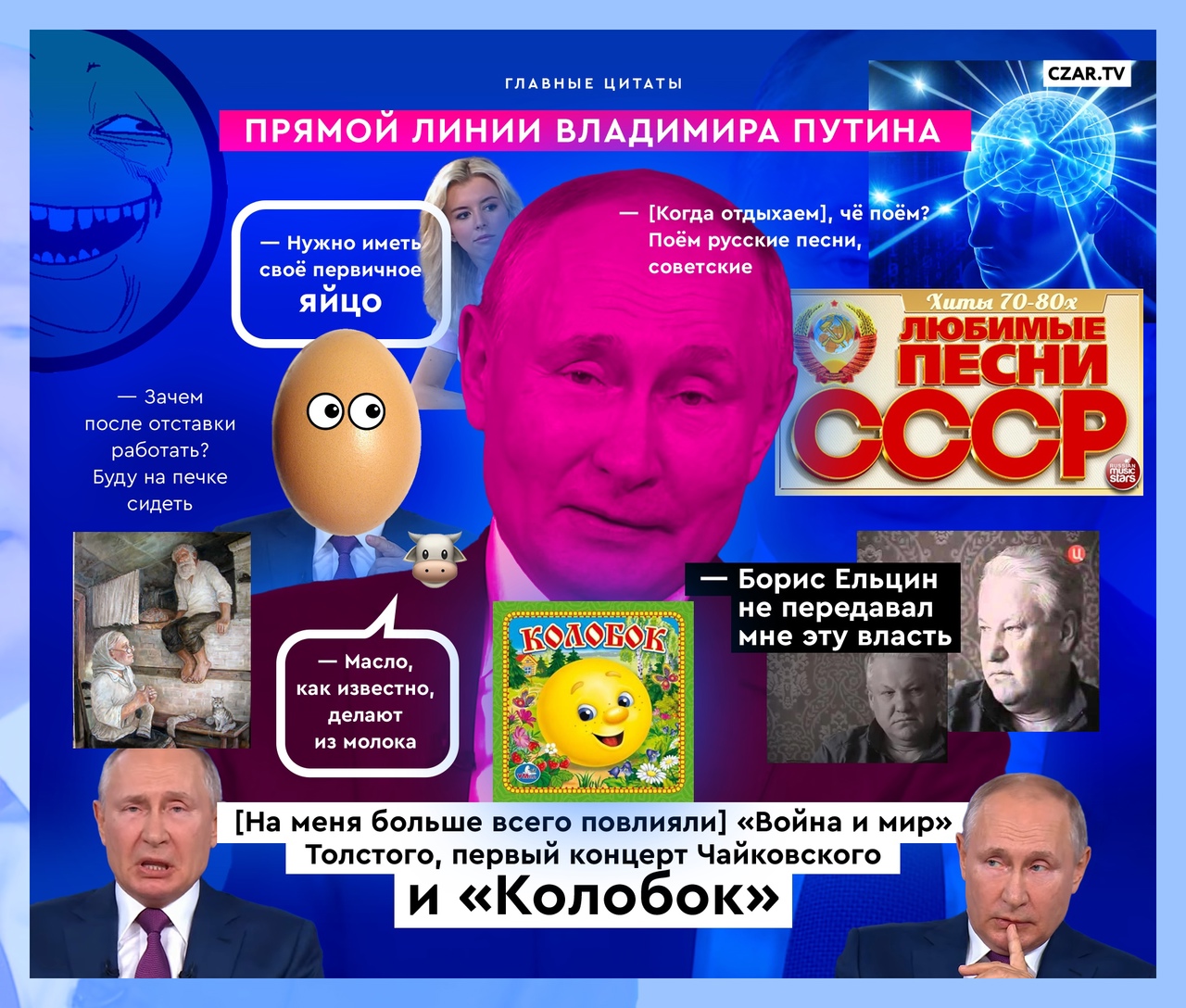 Так, Путин посоветовал безработным регистрироваться в службе занятости. А если вас одолели какие-то проблемы – то просто подумать о хорошем. И обязательно вакцинироваться, ведь как без этого! Также президент рассказал россиянам, что масло делают из молока. И очень важно иметь первичное яйцо. Чтобы курицу растить. Да, это все еще не шизофренический бред обычного сенильного деда, а почти буквальные цитаты из выступления президента России. Спасибо, дорогой наш Владимир Владимирович, будем думать о хорошем и выращивать для тебя первичное яйцо. Ведь, судя по ситуации на Украине, Белоруссии, да и всем постсоветском пространстве, у тебя и первичного яйца нет.