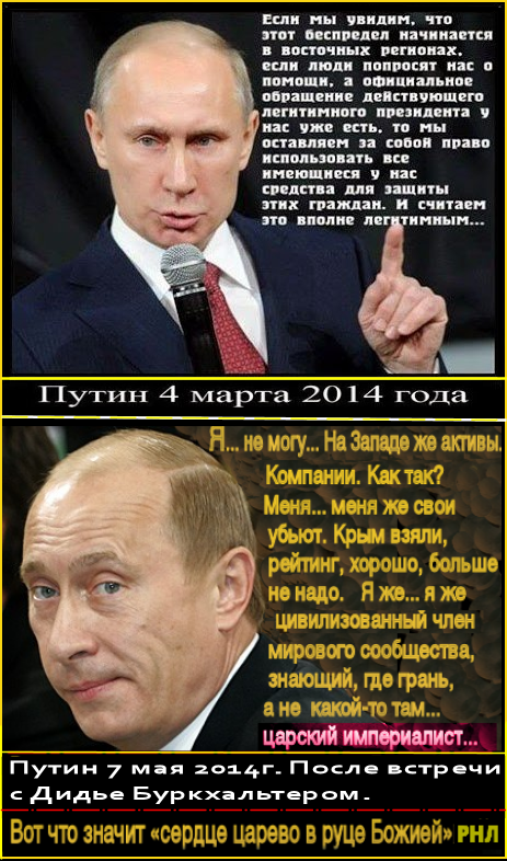 Почему признал "легитимной" русофобскую хунту, захватившую власть в 2014 году? Почему поддерживал ее поставками газа (полгода безплатно) и всем необходимым для ведения карательной АТО против Донбасса: горючим, военными комплектующими, денежными кредитами и даже выдачей ополченцев и оппозиционеров в застенки СБУ? Почему вместо принципиальной защиты мирного населения от постоянных артобстрелов (что должно выглядеть тяжким военным преступлением в глазах западных демократий в сравнении с их отношением к их собственным сепаратистам Квебека, Шотландии, Фландрии, Каталонии, ‒ у которых нет жизненно важных причин для отделения и которых там, тем не менее, никто не бомбит) ‒ Путин лишь слегка журит убийц и их западных покровителей? Почему Путин отказался признать референдумы 11 мая в ЛНР/ДНР, а в Минских соглашениях и вовсе "узаконил" принадлежность Донбасса к Украине несмотря на нелегитимность ее власти? ("Минские соглашения" как геополитический акт кота Леопольда.) А гуманитарная помощь Донбассу предназначена для прикрытия этого предательства в глазах своего народа.