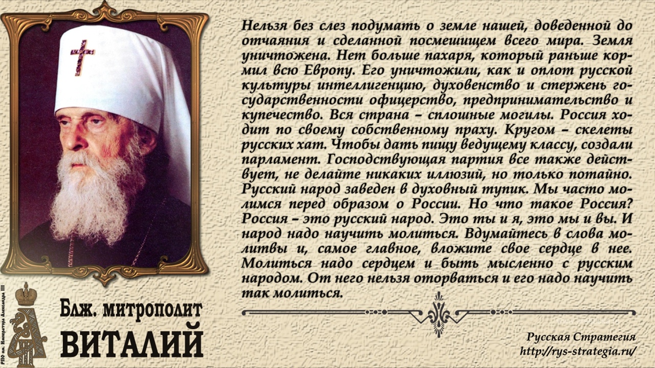 К сожалению, в России тогда возобладали другие силы и другие основы, как и в самой Церкви. Постараемся же хотя бы сейчас, умудренные нашей государственной катастрофой на новом витке, найти в себе силы и мудрость для единения единомышленников из разных церковных юрисдикций в сопротивлении надвигающемуся царству антихриста, приближение которого владыка Виталий ощущал очень остро. Это было бы лучшим почитанием его светлой памяти.