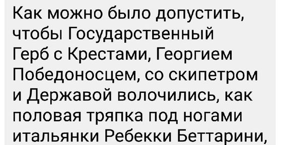 Когда герб России последний раз лежал под ногами , напомню в 1894 г., когда прошло венчание Императора Николая II и Императрицы Александры Фёдоровны (никак не сравниваю её с жидовкой Ребеккой Беттарини), и тогда на мантии Императрицы тоже был изображён двуглавый орёл, так же он был изображён на всех Императорских мантиях при коронациях Императоров и Императриц, начиная с Императора Петра Великого. Императорские мантии, естественно волочились по земле, и никого это не смущало. Здесь вопрос не в мантии, а на каком основании частное лицо использует государственный символ Российской Империи?!