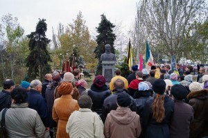 после краткой речи Геннадия Борисовича Григорьева, предводителя Керченского союза монархистов, духовенством была отслужена лития об упокоении душ воинов, живот свой на поле брани положивших в защиту Веры, Царя и Отечества, и о всех безбожной властью убиенных.