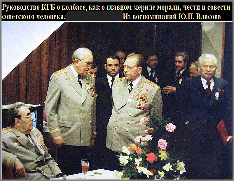 Как я уже упоминал, в разговоре со мной будущий генеральный секретарь ЦК КПСС, а тогда хозяин всемогущей тайной полиции КГБ Ю. В. Андропов обронил: «Дадим людям колбасы вдоволь (или «наделаем» – точно не помню) – и никакого диссидентства не будет». Нет ни декабристов, ни Пушкина, ни Герцена, ни самосожжения религиозных ревнителей веры, ни Бородинской битвы, ни Великой Отечественной войны – борьбы против иноземной кабалы… а есть колбаса. От фундаментальности подобного вывода, надо полагать, просел бы сам Главный Октябрьский вождь: ну не додумался ведь! Дядю мы слушались – хорошо накушались,