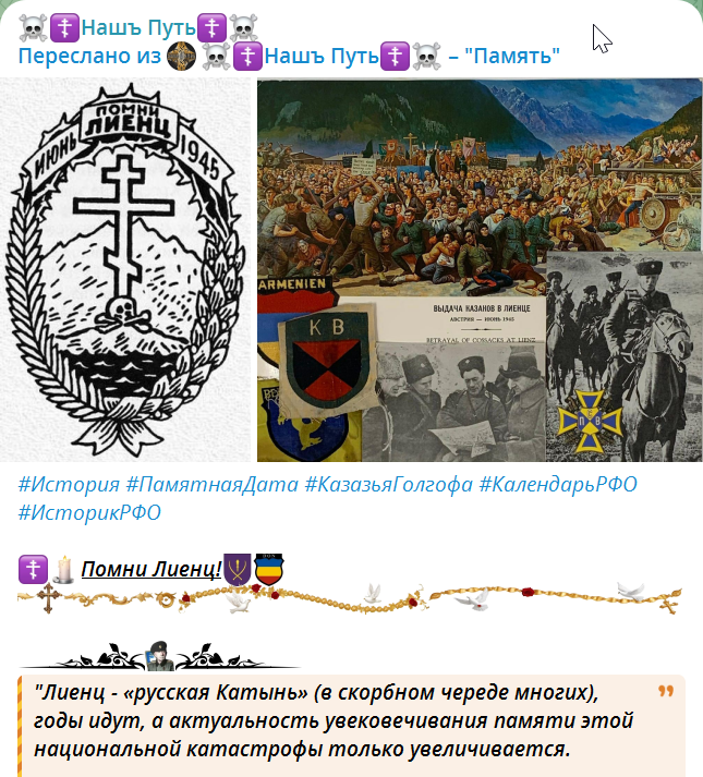 1 июня и Казачья Голгофа в Лиенце в этот день, для нас являются как бы маркером на преданность Исторической ☦России, её ☦Духу, её Божественной сущности! В этот день отчётливо видно, кто стал сволочью-шариковым и сталинистом-людоедом, пособником ЖОРа, а кто остался истинно ☦русским человеком. И таковых, ☦русских, на всю страну осталось немного : РПОИАIII, СРН-МВН, РИД, "Наш Путь", ✠ИКС✠ … и всё.