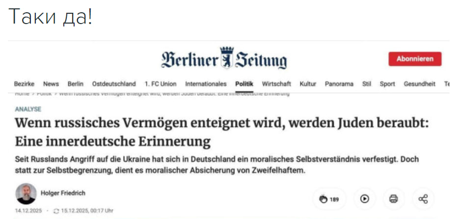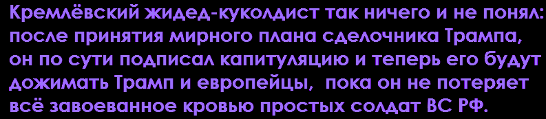 "И тут как гром среди ясного неба. «Зеленский – главное препятствие на пути к урегулированию войны. Путин готов заключить сделку (мир)», – заявил Трамп. И ведь и подумать никто не мог, что сраму не имущий патологический предатель Пыпа давно готов все сдать, но лишь благодаря слону, который не идет ни на какие сделки этого не получается сделать и реализовать тот самый дух Анкориджа."