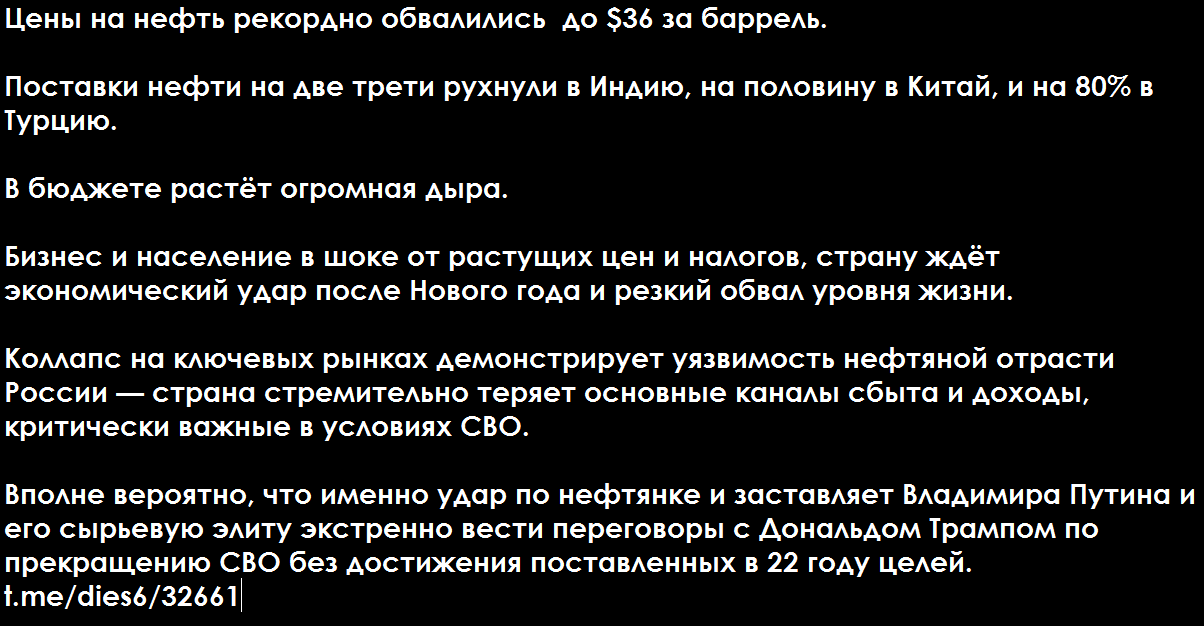 Трамп взял под контроль венесуэльские власти и нефть именно для того, чтобы тут же начать ее продавать по дешёвке крупным партнёрам России – Китаю и Индии. Чтобы им было легче выполнять директивы Белого дома и послать нашу нефть куда подальше. То есть президент США дальновидно и последовательно уничтожает нашу экономику. Он делает всё для краха/социального взрыва в России.А в это же время пресс-секретарь президента РФ Песков заливает СМИ про непоколебимость духа Анкориджа. И поступают инсайды (в частности, от издания Bloomberg), что на переговорах мы рассматриваем в том числе допуск американских компаний к нашим природным ресурсам. Как бы все это назвать цензурно? — "АНКОРИДЖА ДУХ" – ПРОТУХ.