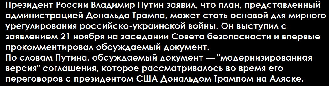 - Крым, Луганск и Донецк (в плане названы именно города, но, скорее всего, речь про Луганскую и Донецкую области) будут признаны де-факто российскими, в том числе со стороны США. Херсонская и Запорожская области будут поделены по текущей линии фронта. Россия отказывается от других захваченных территорий, которые она контролирует за пределами четырех украинских регионов и Крыма. Украина выводит войска из той части Донецкой области, которую сейчас контролирует, эта зона будет буферной и считаться российской.