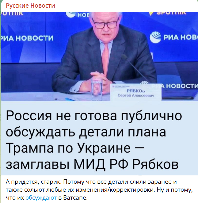 "В последнее время в СМИ появилось умиление по поводу американского плана мирных соглашений. Однако чему умиляться? Невооружённым глазом видно, что это очередной план замораживания конфликта, ещё одна попытка украсть у нас победу, сохранить осиное гнездо в виде осколками так называемой Украины под боком у России. Посмотрим, поведётся ли нынешняя российская власть на очередную американскую обманку."