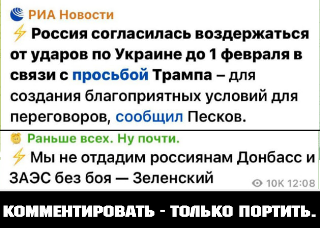 Трамп попросил Путина прекратить удары по энергообъектам Украины до 1 февраля «с целью создания благоприятных условий для проведения переговоров», заявил дудка Путина – Дмитрий Песков.