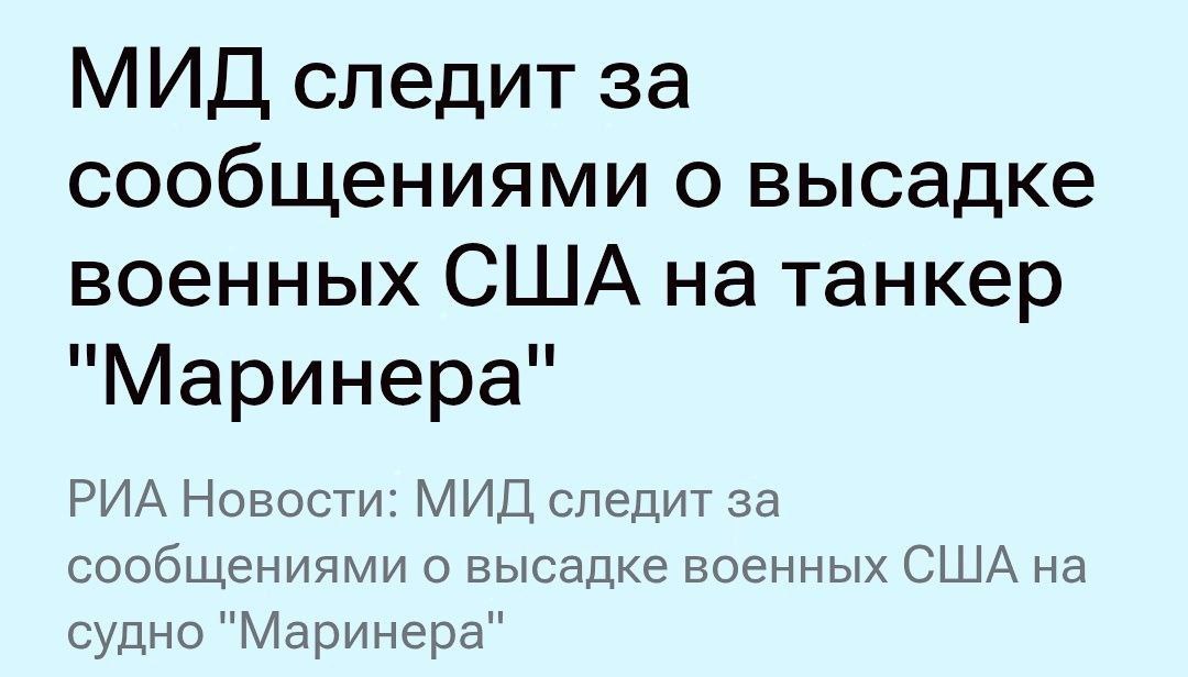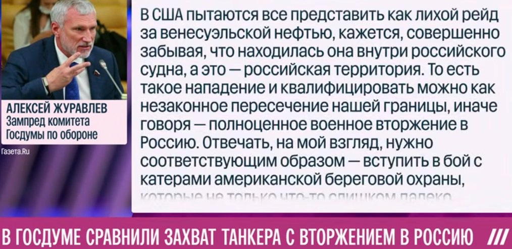 Логика американцев понятна. Они устанавливают контроль над венесуэльской нефтью и поэтому будут действовать именно так, будь то русский, китайский или иранский танкер. К американцам, в общем-то, и вопросов нет – их мотивы ясны. Вопросы здесь возникают к нам, и в частности к тем, кто должен решать эти задачи. В первую очередь к Военно-морскому флоту, – заключил Андрей Пинчук. https://rusidea.org/250979778