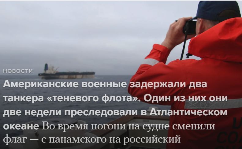 «Американские силы поднялись на борт находившегося под санкциями нефтяного танкера между Исландией и Британскими островами — до того, как туда смогли прибыть российские военные корабли и подводная лодка, сообщили официальные лица. Ранее танкер назывался Bella 1, однако сменил флаг и стал российским судном».