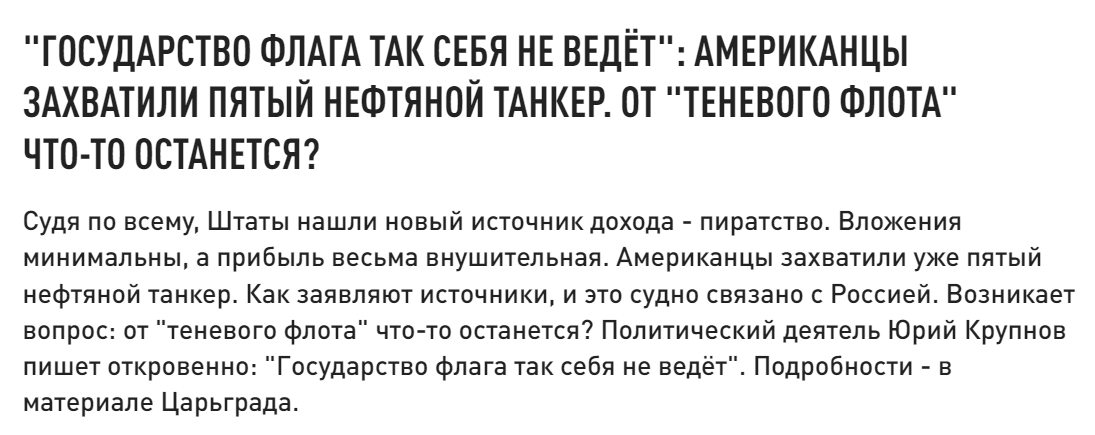 "Факт – впервые в новейшей истории Соединённые Штаты нанесли публичный оскорбительный жест в отношении Российской Федерации в виде захвата двух танкеров РФ. Впервые! Подобного не было даже в лукавые времена Ельцина. Про СССР и говорить не стоит – при всей кондовости системы мы всегда пытались дать ответ на хамство американцев и шли до конца, напоминали им о хороших манерах.