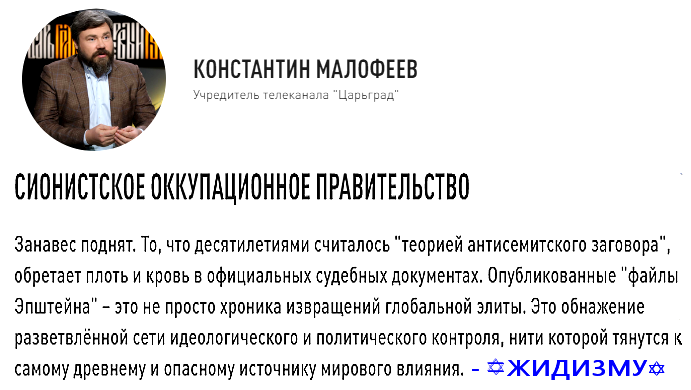 "Файлы Эпштейна" доказывают, что почти весь западный мир покорился сионистской воле. США, Британия, Евросоюз – ранее христианские страны перестали ими быть. Простые люди ещё ходят в храм, но элиты действуют вопреки своим национальным интересам. Они находятся под влиянием финансовой сети ✡️Ротшильдов и Эпштейнов✡️. Им нравятся расистские крики о "гоях-животных".