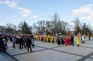Пройдя по центральной площади города под звон соборных колоколов, молящиеся подошли к памятному знаку в честь посещения Керчи Петром І (монархом из династии Романовых, первым побывавшем в городе) и месту утраченной Благовещенско-Николаевской церкви при бывшей мужской гимназии, носившей имя Александра II. Здесь митрополит с сонмом священнослужителей совершил поминальную литию по почившим правителям из династии Романовых, также были пропеты молитвословия Пресвятой Богородице и Николаю Чудотворцу.