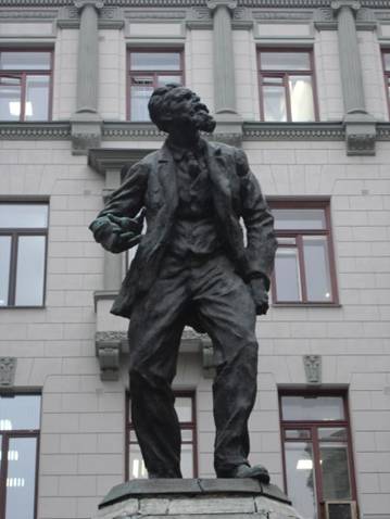 Памятникъ Воровскому въ Москвѣ на одноименной площади . Неизвѣстно точно, что хотѣлъ выразить скульпторъ, изображая Воровскаго въ столь уродливомъ видѣ, но, какъ бы тамъ ни было, получилось изваяніе, весьма точно отражающее сатанинскую сущность большевика Воровскаго: передъ нами человѣкъ, либо мучимый бѣсами, либо скорченный отъ адскихъ, геенскихъ мукъ.
