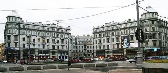 Дореволюціонный и современный видъ угла улицъ Большая Лубянка и Кузнецкій мостъ въ Москвѣ. Памятникъ Воровскому расположенъ въ глубинѣ двора.