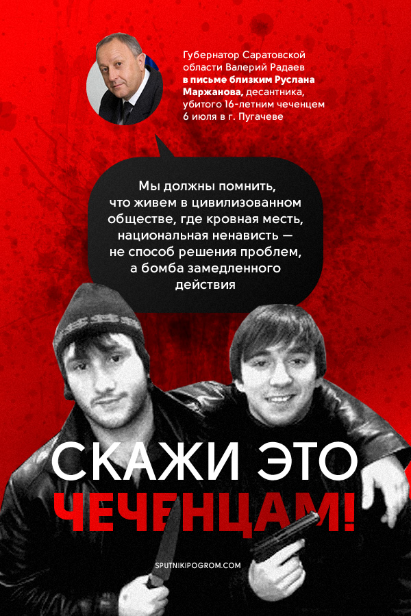 «Звучат требования выселения выходцев с Кавказа из Пугачева. Люди кричат, что уже несколько лет молодые люди не могут спокойно ходить по городу. Перед началом митинга мать убитого Руслана Маржанова заявила журналистам, что убийца действовал профессионально и исподтишка. Обстановка накалена до предела», – передает издание.