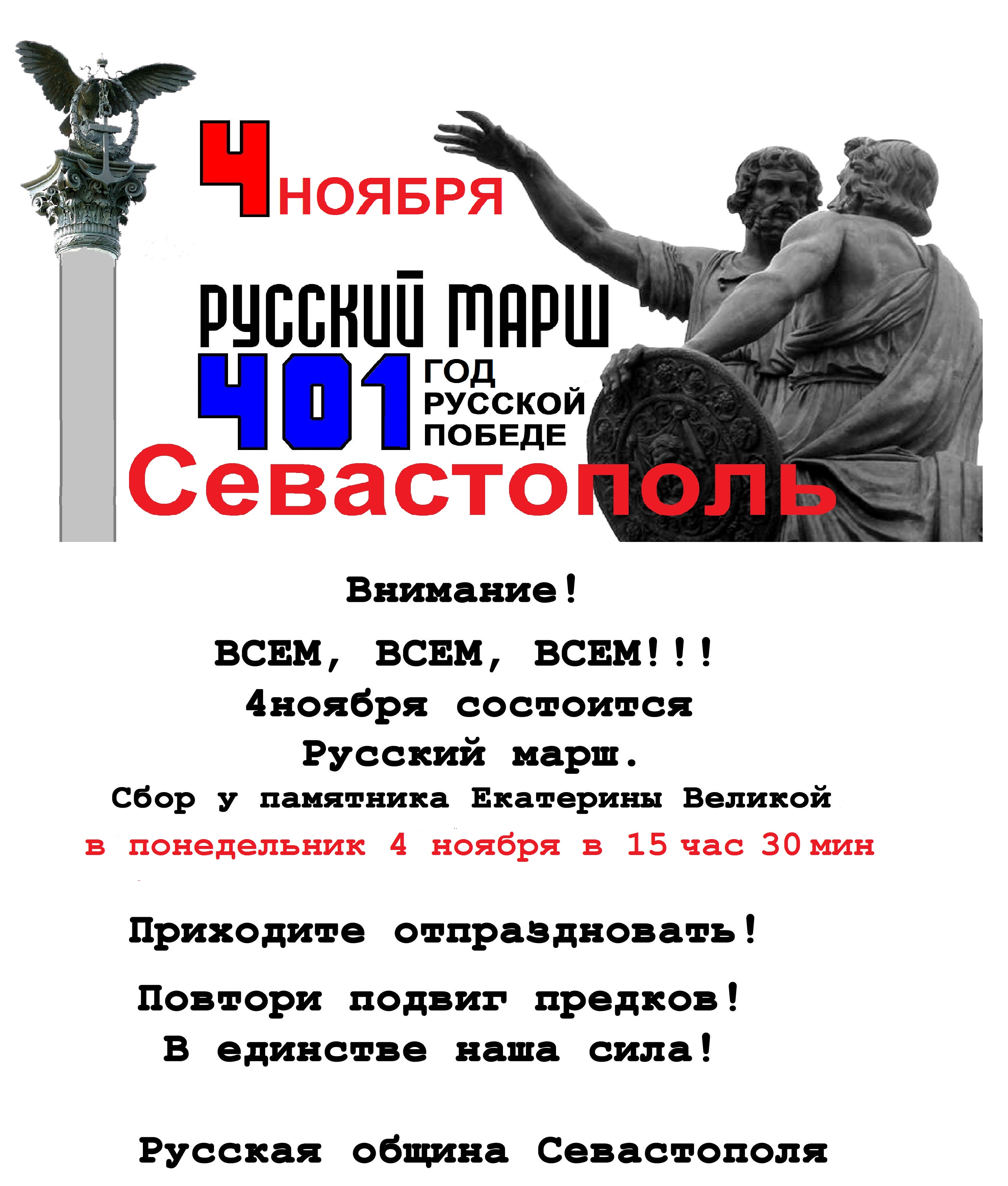 | КЕНИГСБЕРГ | http://vk.com/rumarsh13 | Срочное сообщение! РУССКИЙ МАРШ В КЁНИГСБЕРГЕ перенесён на 3 НОЯБРЯ (воскресенье). Соответствующее уведомление подано в администрацию города. Перенос даты связан, во-первых, с тем, что 4 ноября в предполагаемом месте проведения шествия уже назначено другое публичное мероприятие, а во-вторых потому, что воскресный день 3 НОЯБРЯ гораздо удобнее для многих участников Русского Марша. Итак, сбор участников 3 НОЯБРЯ (воскресенье) в 11:30 у Юбилейного моста (Рыбная деревня). Начало шествия в 12:00. |