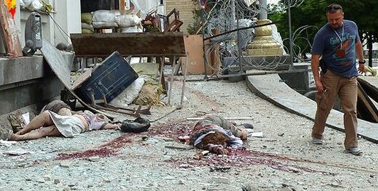 Сегодня украинская авиация нанесла удар по центру Луганска, погибло восемь человек, ранено — двадцать восемь, в основном — женщины, которых при всем желании нельзя записать в «вооруженных сепаратистов». Выглядят последствия удара так: