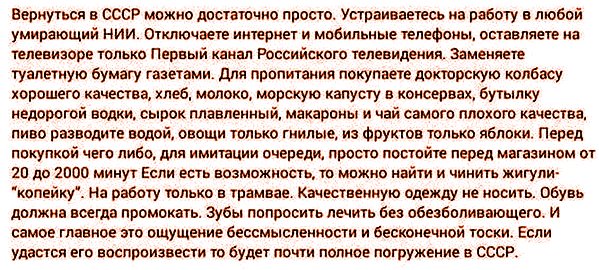 даже если в СССР не все было хорошо, у нас были ошибки, наши предки могли ошибаться, но их все равно надо уважать“. Не знаю, как у сторонников СССР, но у меня предки не Советский Союз, а папа и мама, которые не входили в КПСС, не занимали руководящих государственных постов и не имели никакой возможности разрабатывать политику Советского Союза. Более того, они не имели возможности даже проголосовать против политики Советского Союза, как обычные граждане, или там выйти на митинг. Легитимные формы демократического протеста в СССР назывались “антисоветской деятельностью и агитацией”, и карались бесплатными путевками на курорты Магадана. Мои бабушки и дедушки также не входили в правящую номенклатуру СССР, и не имеют никакого отношения к организации ГУЛАГа, посеву кукурузы за Полярным кругом или финансированию легкой промышленности по остаточному принципу.