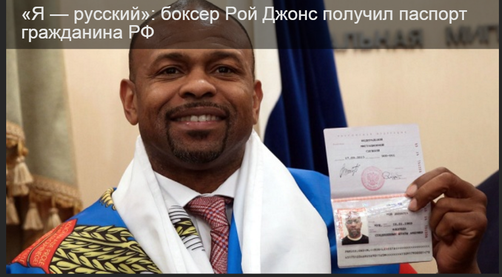 Звезда мирового бокса Рой Джонс-макака черножопая, не говорящая по-русски стал гражданином РФ .Американскому спортсмену без очереди торжественно вручили российский паспорт в одном из центральных отделений Федеральной миграционной службы.