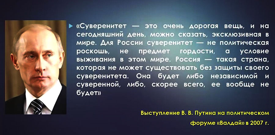 Проблема в том, что суверенитет — безотносительное понятие. Он или есть или его нет. Если мы несуверенны в отношении наших денег, значит, и в других областях у нас дела обстоят примерно так же. Достаточно вспомнить агентов ЦРУ в Госкомимуществе Чубайса, о наличии которых сам Путин, не дрогнув лицом, сообщил на какой-то из встреч с охлосом. При этом никто Чубайса, естественно, не утомляет вопросами, как так получилось, что его ведомством по факту управляли иностранцы, причем ведомство как раз в то время закладывало основы нынешней молодой 20-летней России.